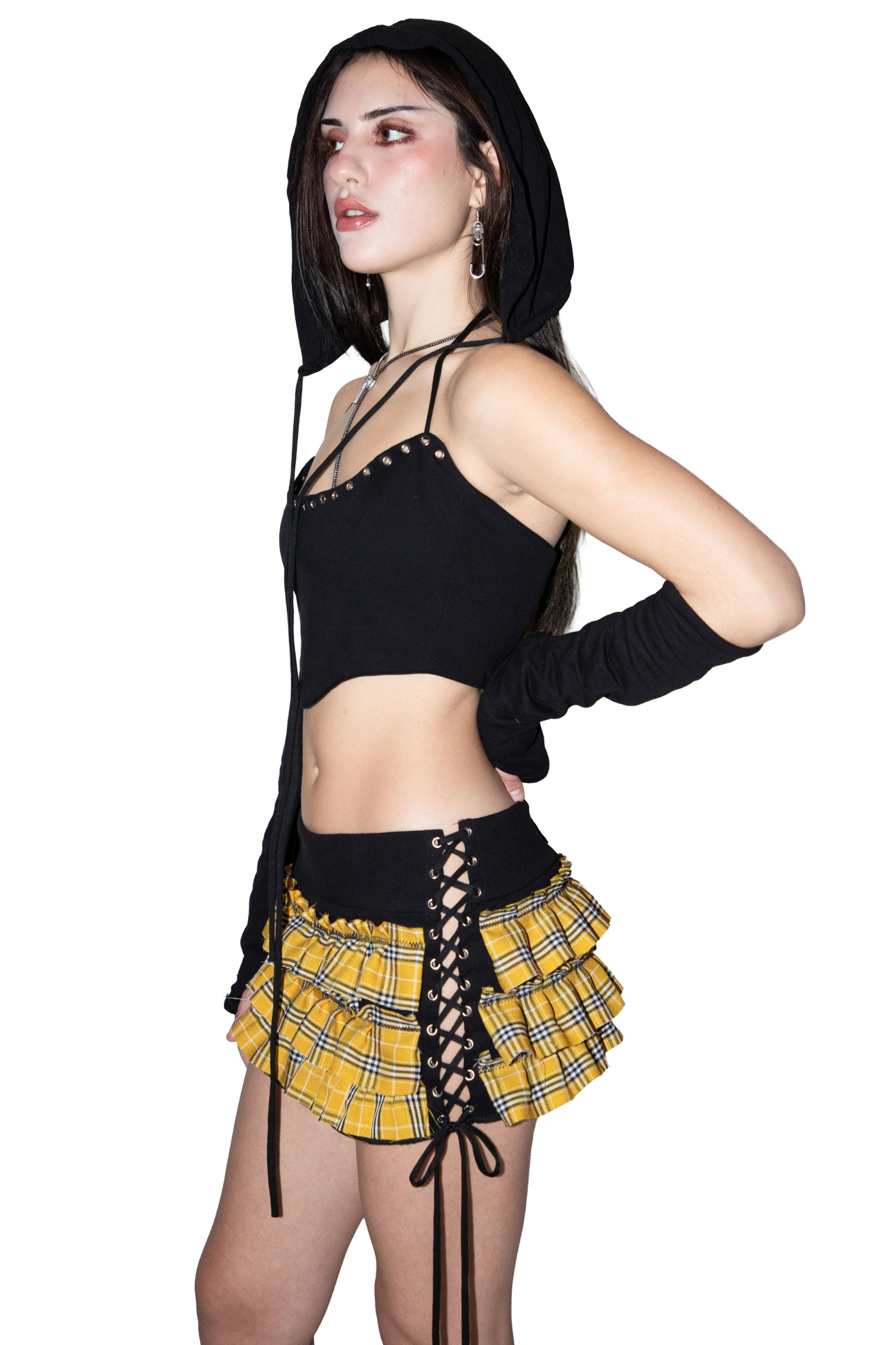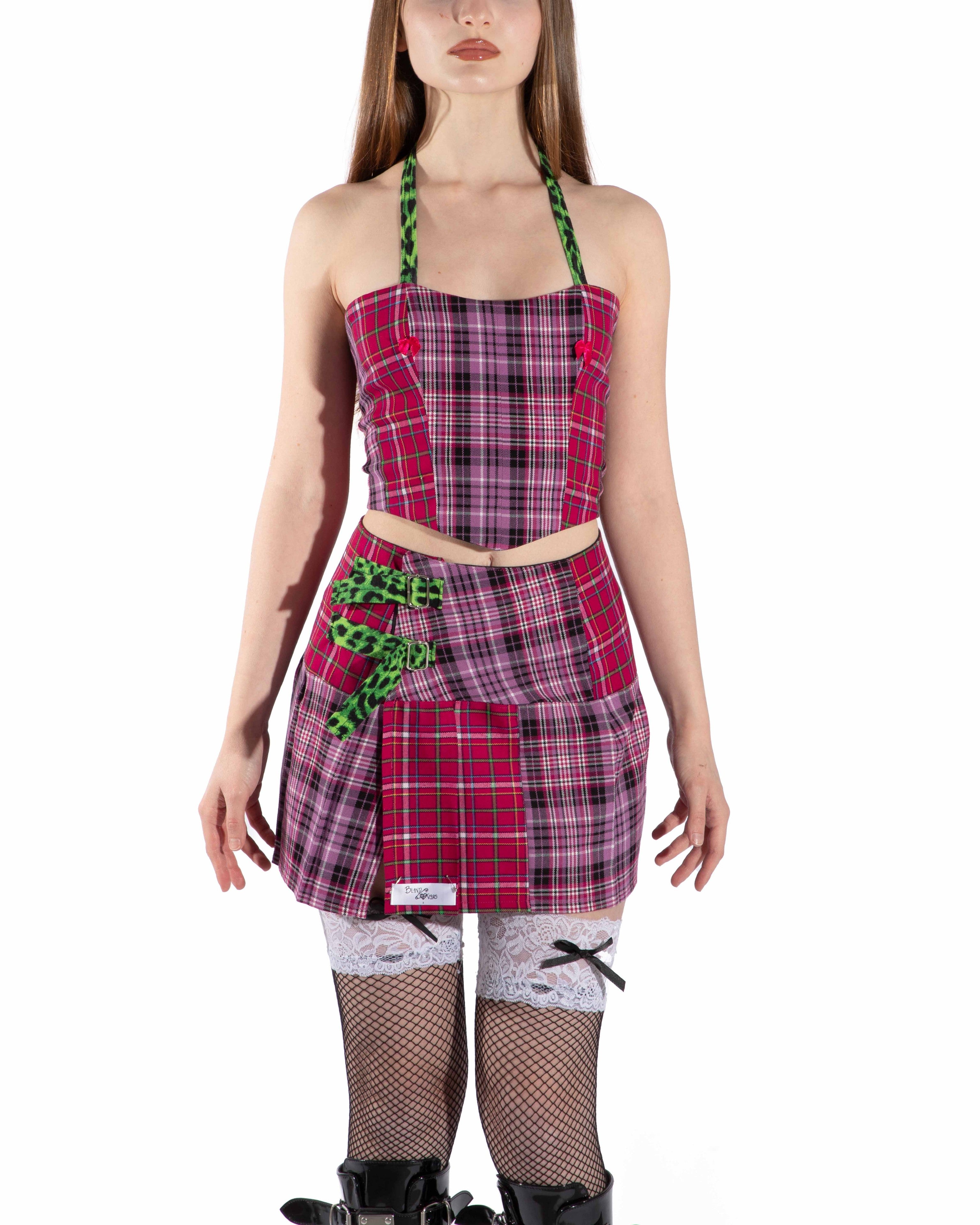 completo tartan fucsia e rosa a contrasto con bretelle e allacciatura verde brat leopardato, il corsetto presenta allacciatura con occhielli...